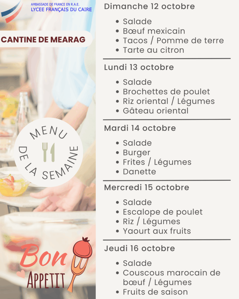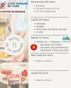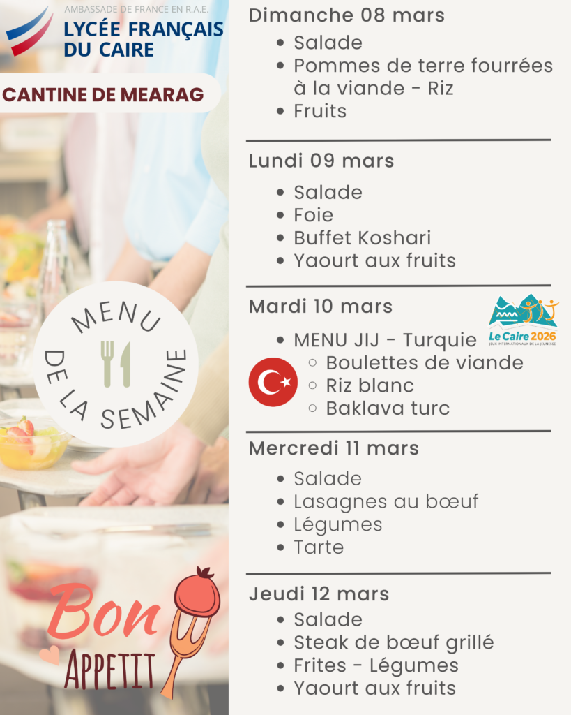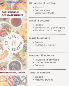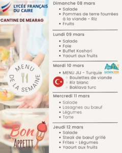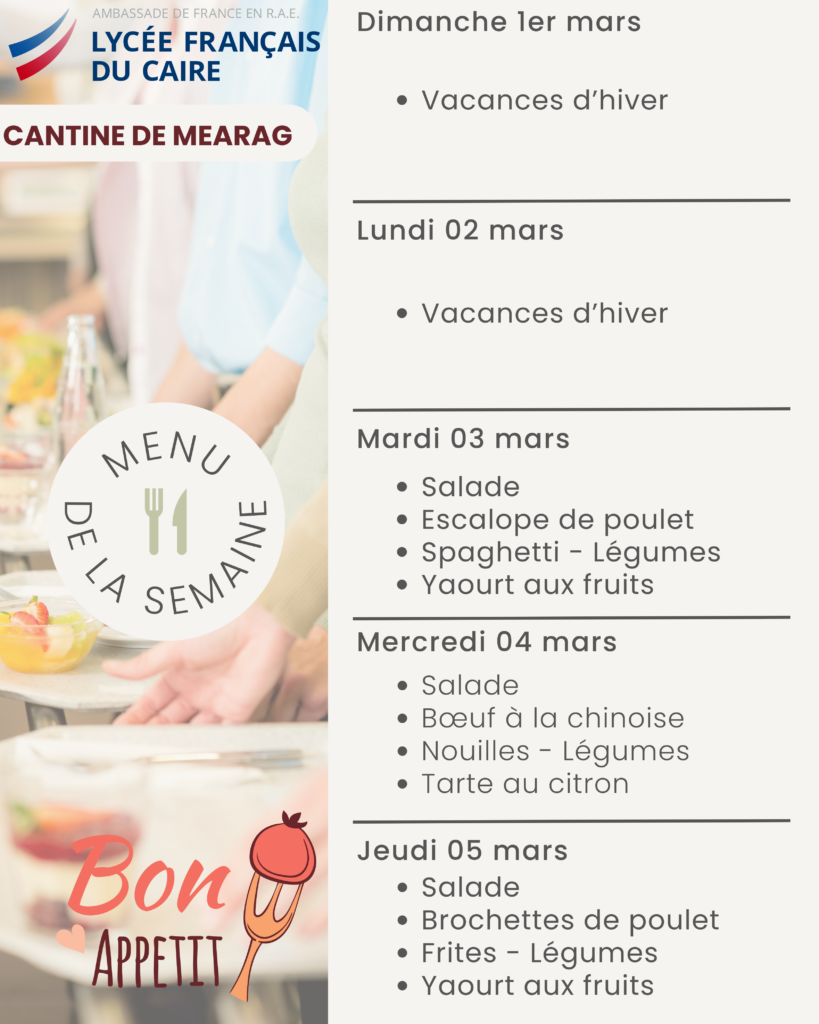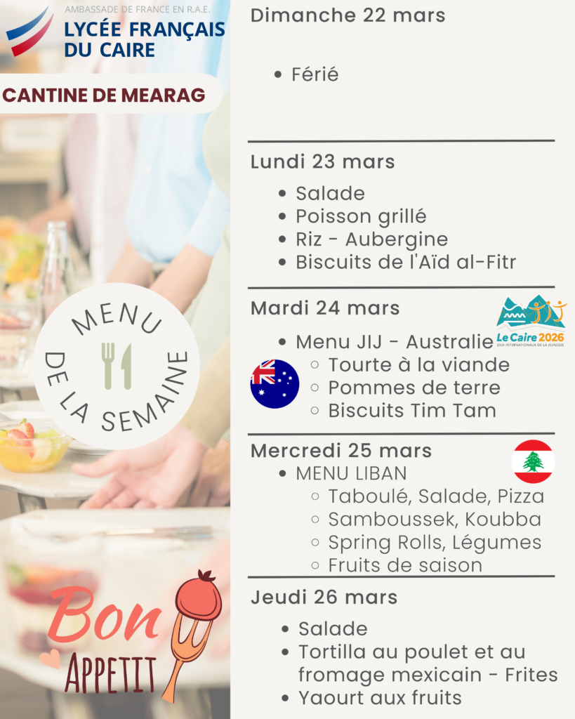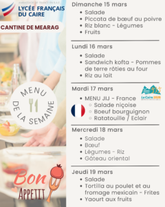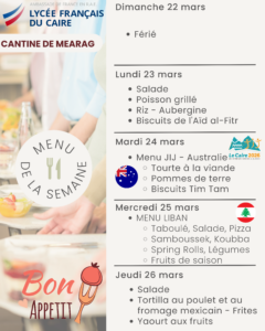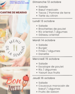 La cantine quant a elle est ouverte tous les jours sur deux services à la pause méridienne. Le prix d’un ticket repas (entrée/plat/dessert) est de 150 EGP.