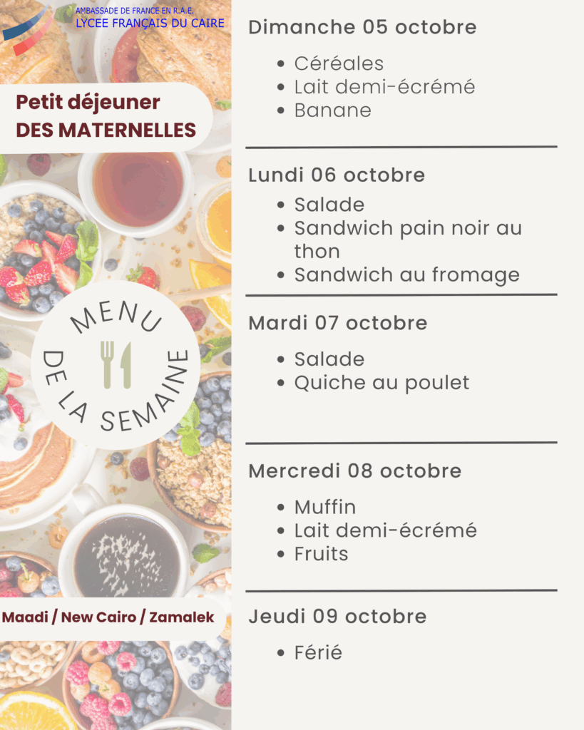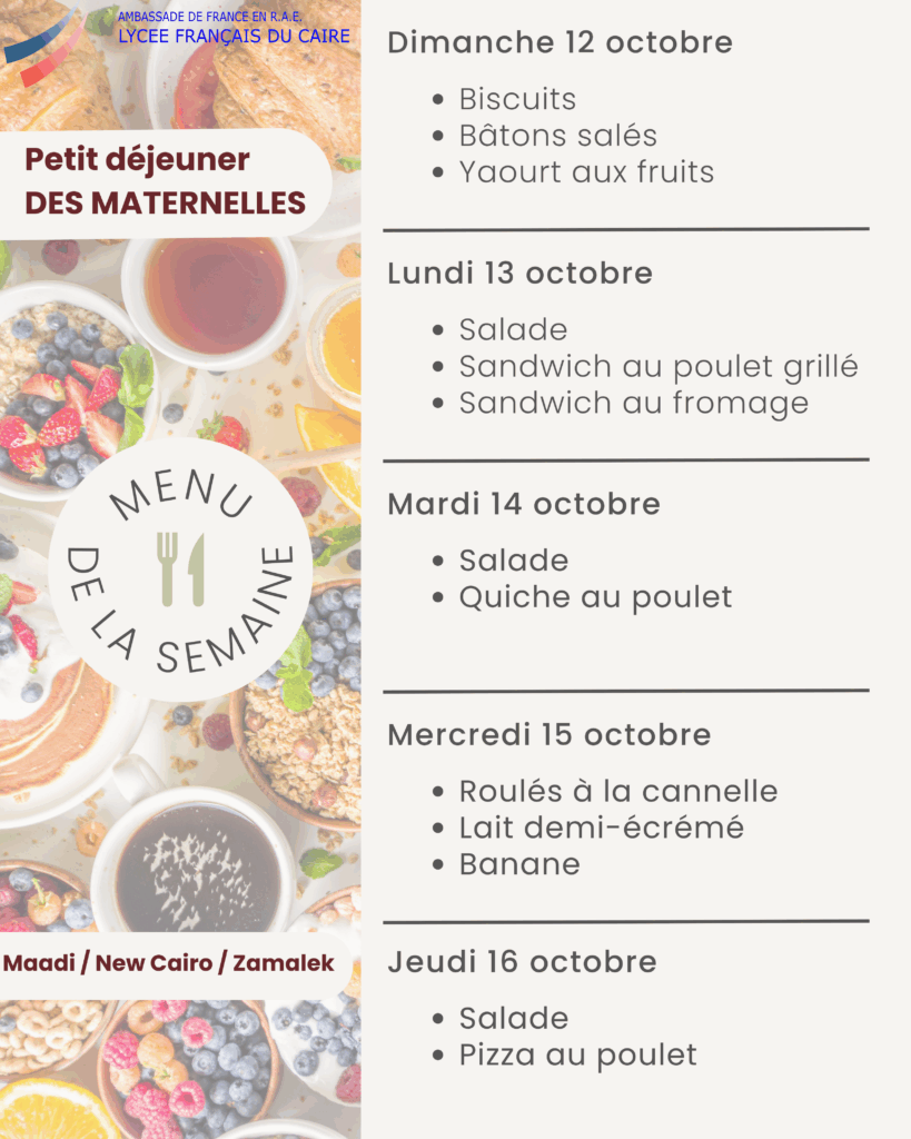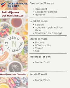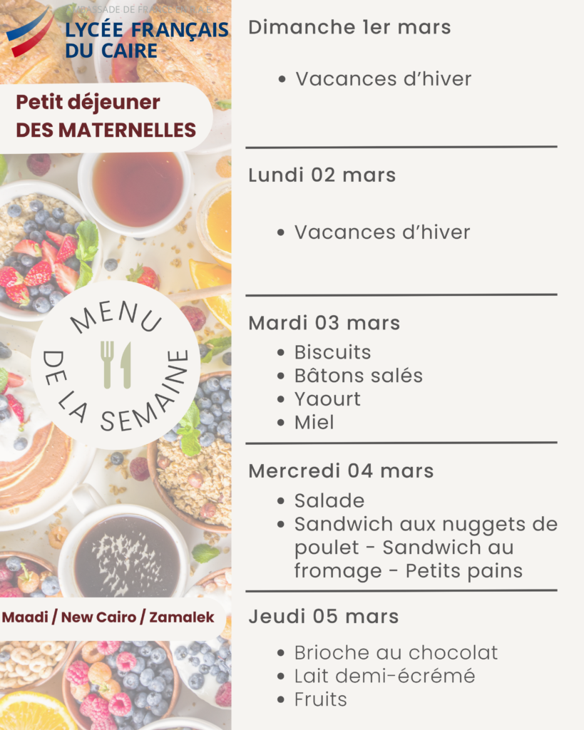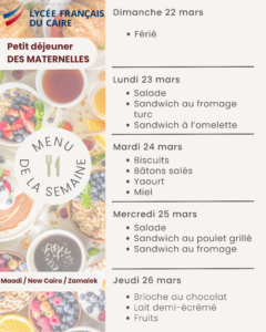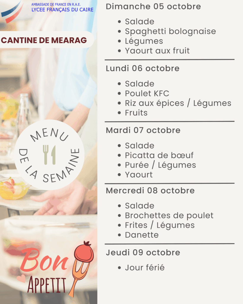 La cantine quant a elle est ouverte tous les jours sur deux services à la pause méridienne. Le prix d’un ticket repas (entrée/plat/dessert) est de 150 EGP.